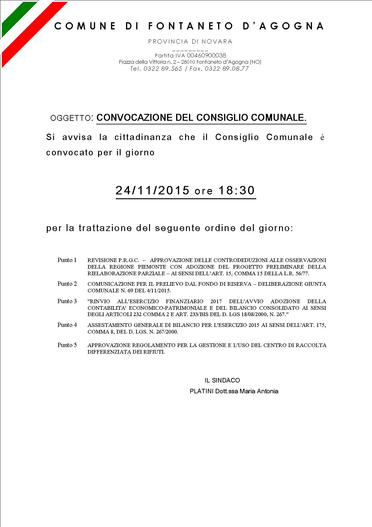 IL CONSIGLIO COMUNALE E' CONVOCATO PER IL GIORNO 24/11/2015 ALLE ORE 18:30.