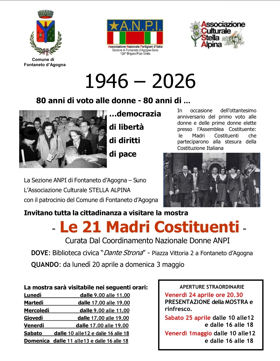 In occasione dell' 80° anniversario del voto delle donne, dell'elezione delle prime donne presso l'Assemblea Costituente e per festeggiare ancora in un modo ancora più significativo il 25 aprile per Fontaneto d'Agogna, venerdì 24 aprile 2026, alle ore 20:30, presso la biblioteca Civica Dante Strona, avrà luogo la cerimonia di inaugurazione della mostra "Le 21 Madri Costituenti".