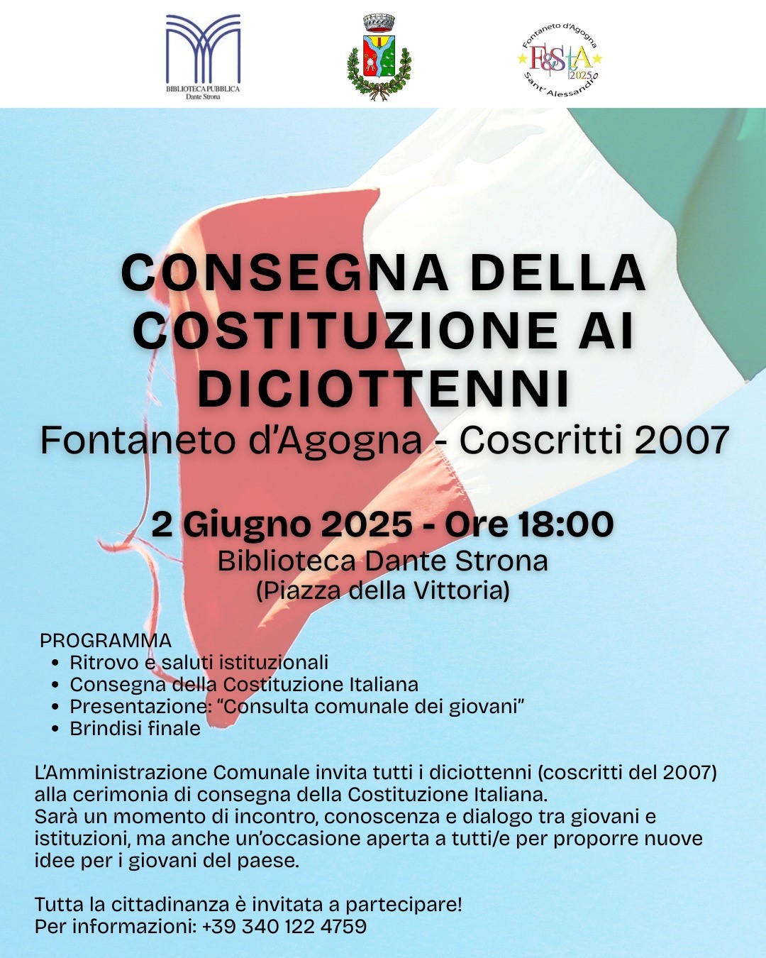 Lunedì 2 giugno, in occasione della Festa della Repubblica di cui ricorre il 79° anniversario, alle ore 18:00, l'Amministrazione comunale invita tutti i diciottenni (coscritti del 2007) presso la Biblioteca comunale "Dante Strona" alla cerimonia di consegna della Costituzione italiana.